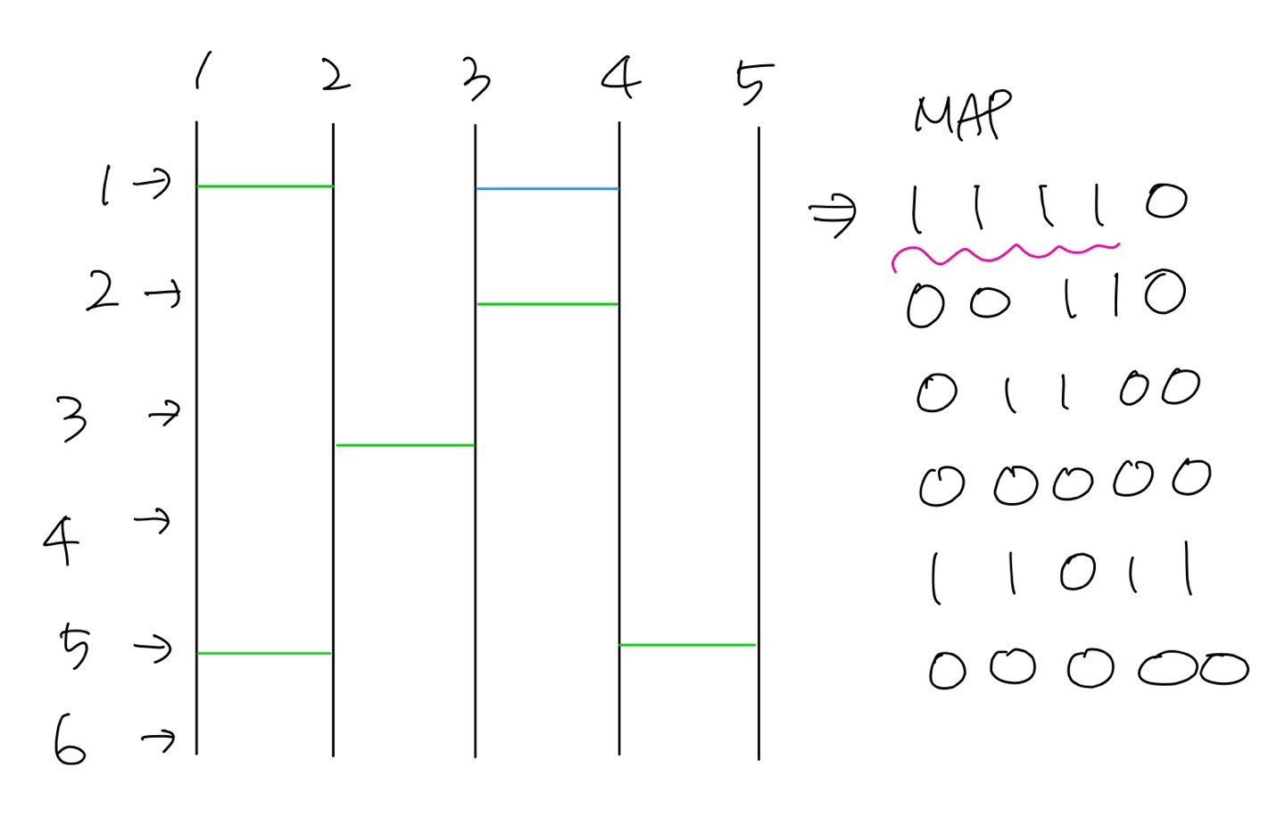 1-2번을 연결하는 사다리와 3-4번을 연결하는 사다리가 놓였을 때, MAP으로 표현하면 2-3번도 연결되어 있는걸로 감지한다.