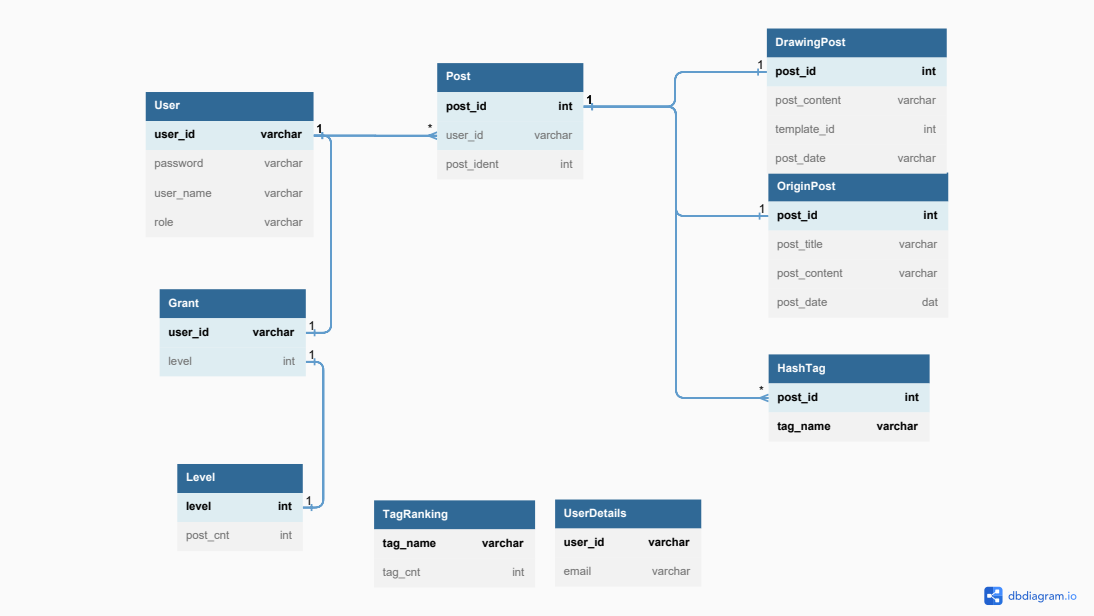 - 글 번호는 Post 테이블의 Key를 외래키로 참조 및 기본키로 등록