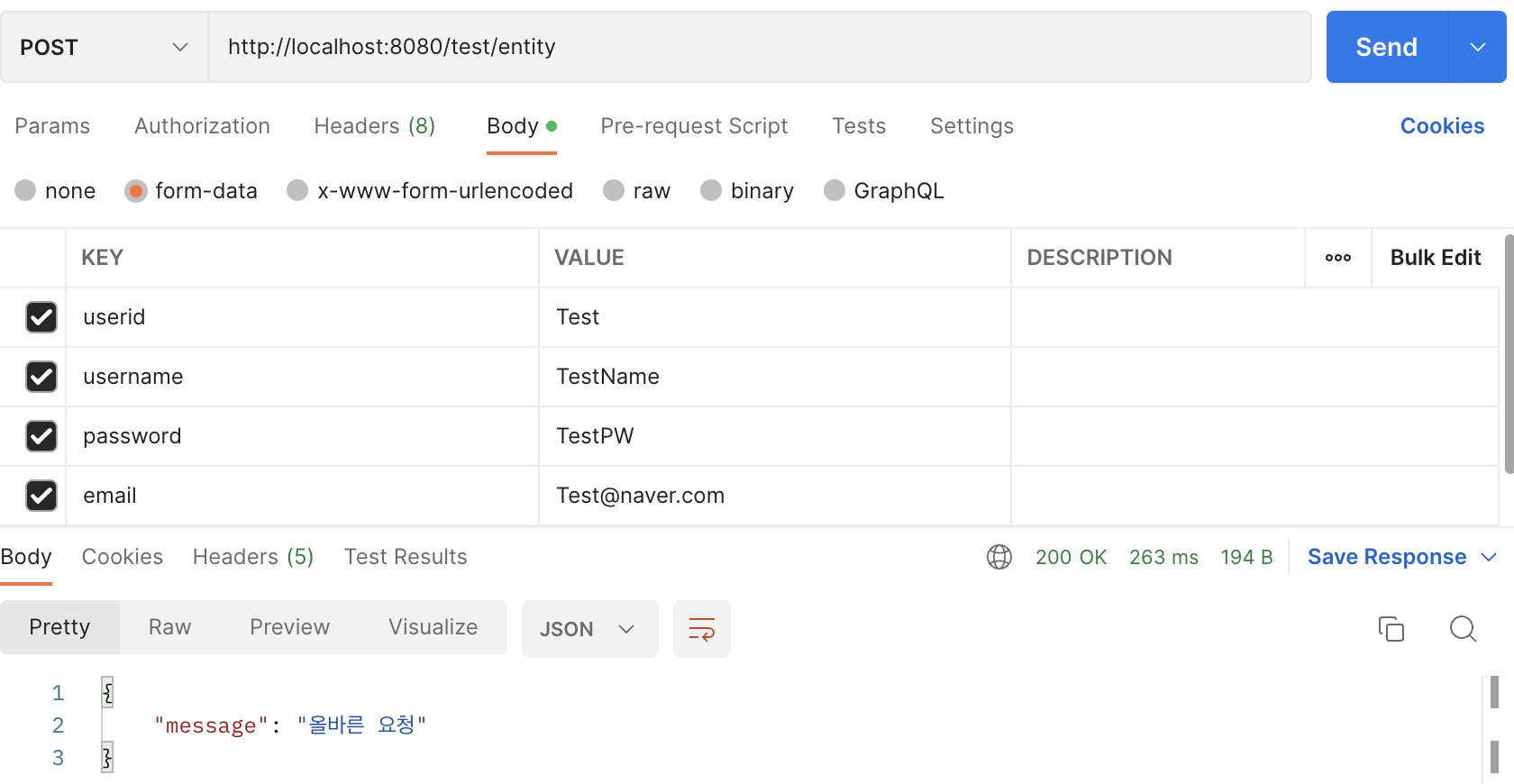 사용자 정보를 모두 채워서 보낸 경우 → 올바른 요청, 200 OK