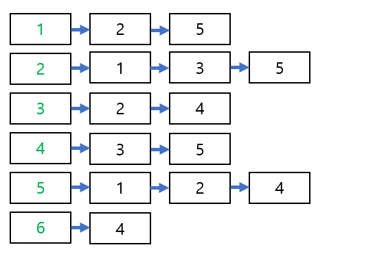 - 각 노드에 인접하게 연결되어 있는 노드들을 순서에 상관없이 이어준다