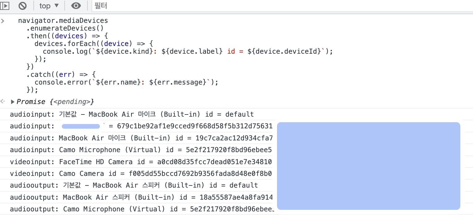 공식문서 참조 : https://developer.mozilla.org/en-US/docs/Web/API/MediaDevices/getUserMedia