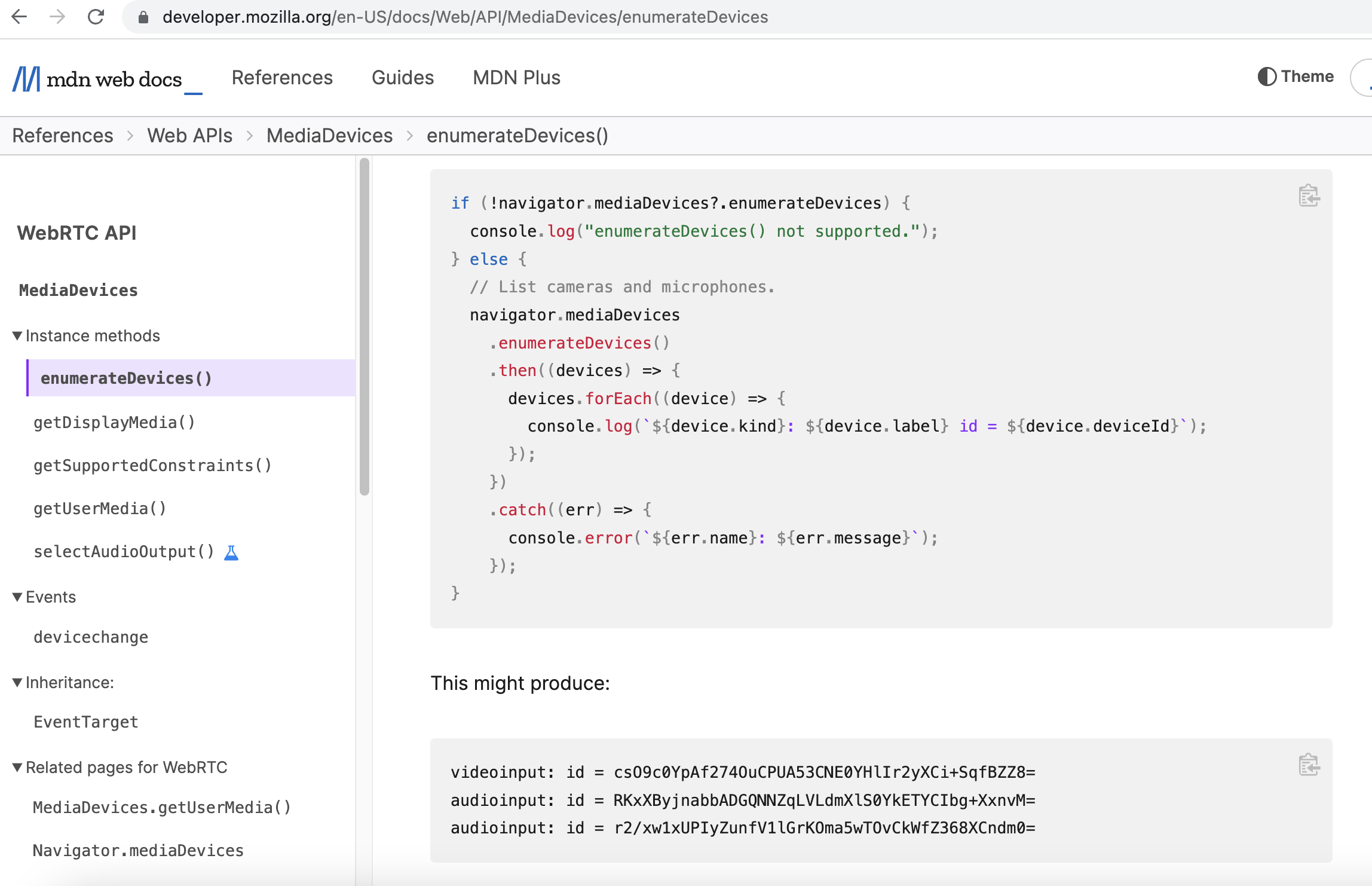 const devices = await navigator.mediaDevices.enumerateDevices();