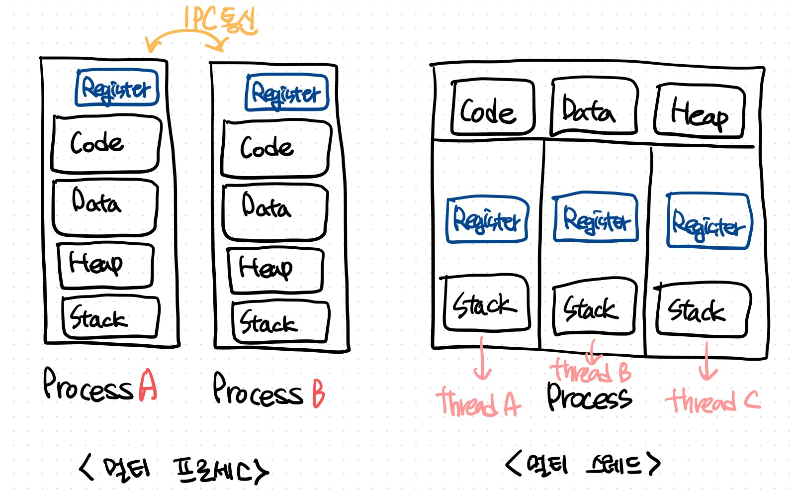 - 스레드는 프로세스 내 주소 공간이나 자원들(Heap 공간 등)을 같은 프로세스 내 스레드끼리 공유하며 실행
