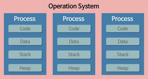 - 각 프로세스는 독립된 영역 (Code Data Heap Stack)을 할당 받음
