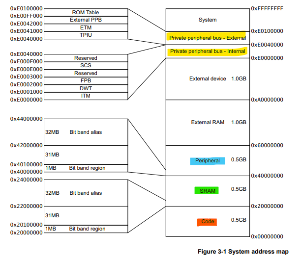 - 노란색 - ARM 사의 표준 주변장치 영역 (Systik Timer, NVIC, MPU, SCB 등)