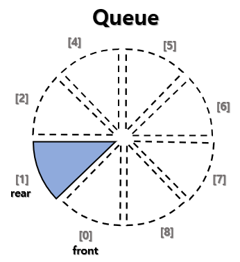 - 원형 큐에서는 포화상태와 공백 상태를 구별하기 위해서 항상 하나의 자리는 비워둔다