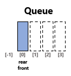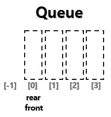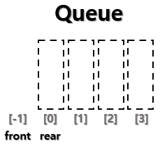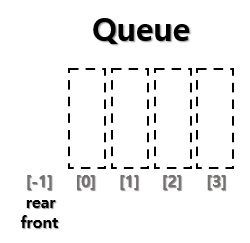 - 1차원 배열을 정의한다 - 삽입, 삭제를 위한 변수인 front와 rear을 만든다 - front와 rear의 초기값은 -1이다 |