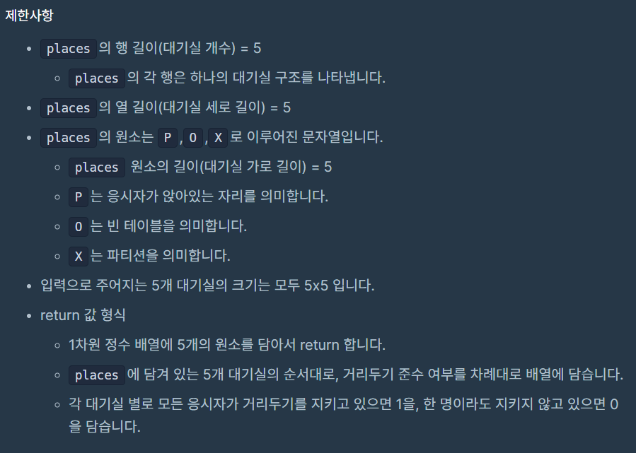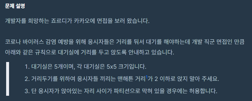 거리두기를 잘 지켜서 앉아있는지 확인하기 위한 코드를 구현하는 문제이다