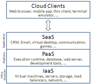 - 웹 상에서 구글, 마이크로소프트, 아마존 등에서 제공하는 환경의 네트워크, 보안, 데이터 저장소, 콘텐츠 딜리버리 서비스를 포함한 다양한 인프라를 임대하여 이용할 수 있는 서비스