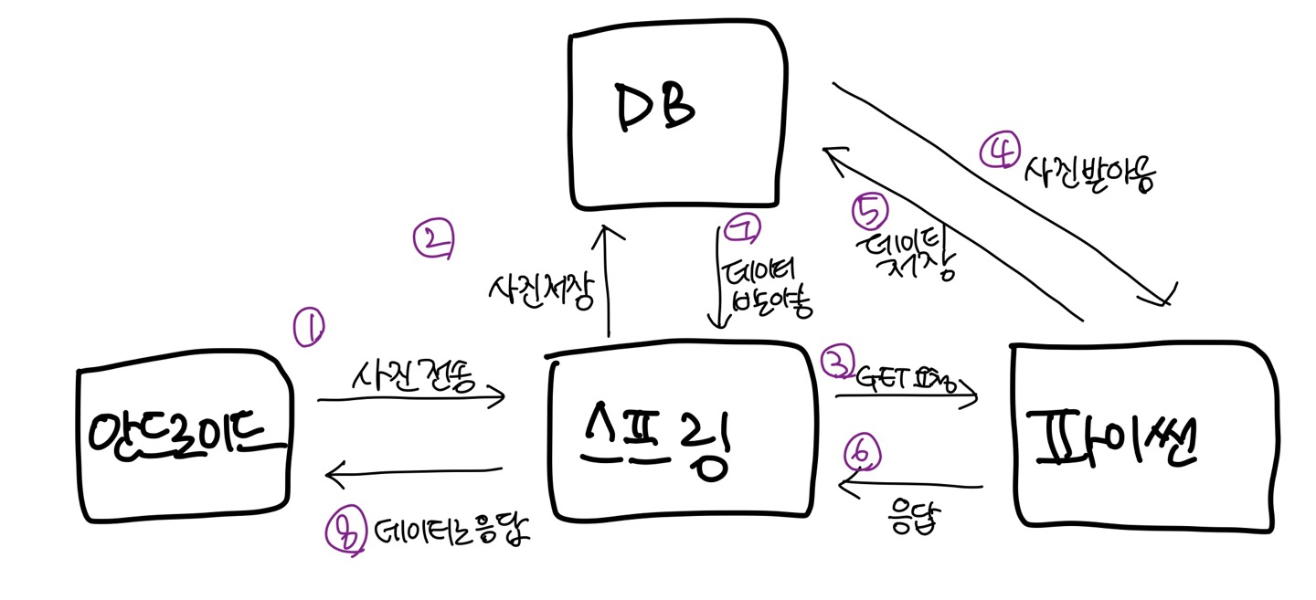 Python에서 읽어와 DB에 담아주면 Spring에서 DB에서 값을 읽어서 안드로이드로 넘겨준다