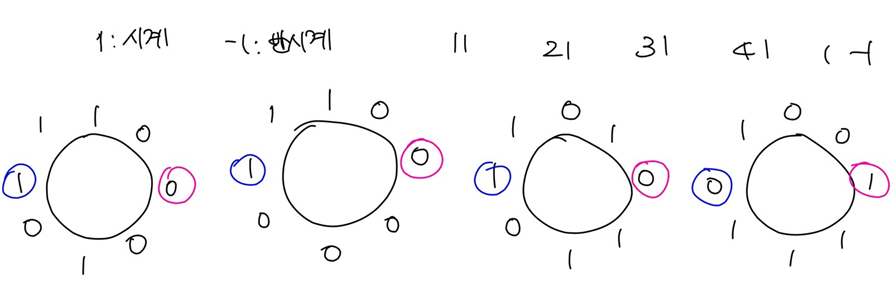 나는 2번째 톱니바퀴가 돌면.. 양 옆으로 한개씩 보고 돌릴지 안돌릴지 판단하고 구현했는데,